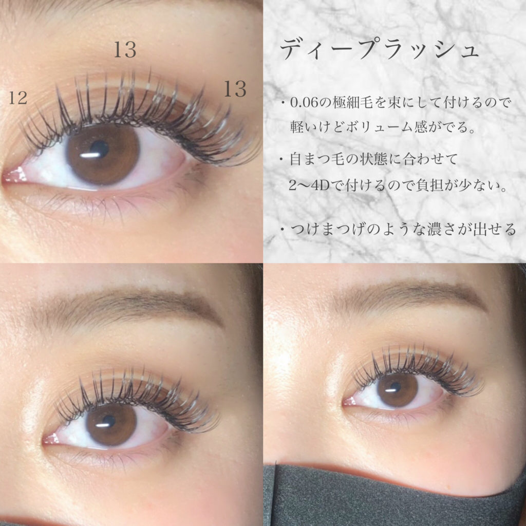 当店のディープラッシュは、0.06の極細のエクステをボリュームラッシュのように毛先は開かず閉じてお付けします!